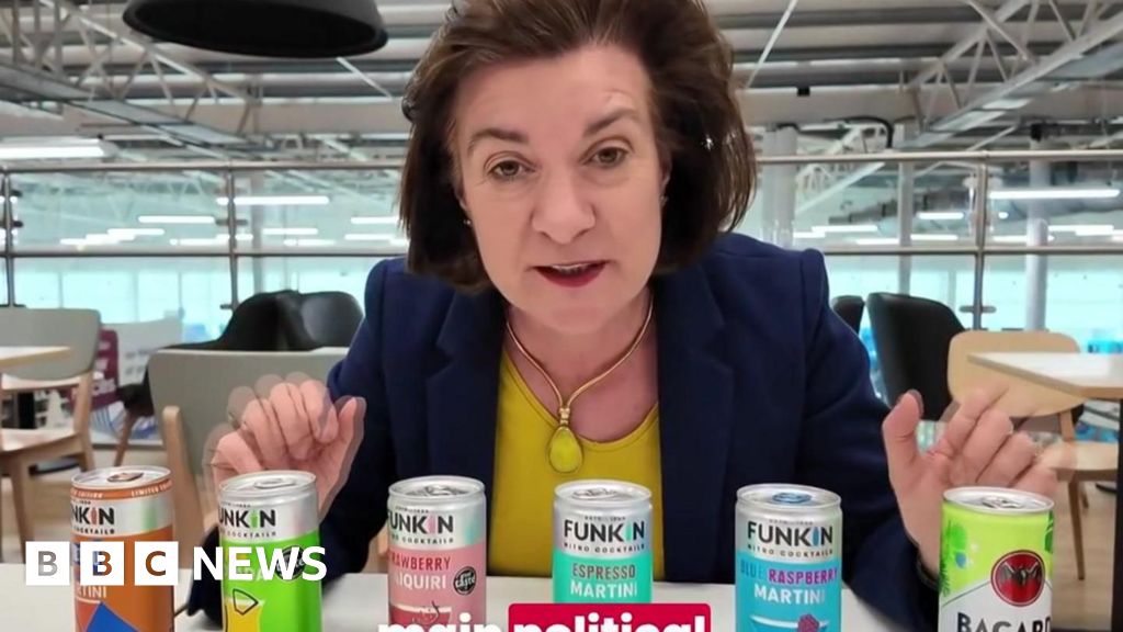 Eluned Morgan looking into the camera, smiling, with six cocktail cans in front of her